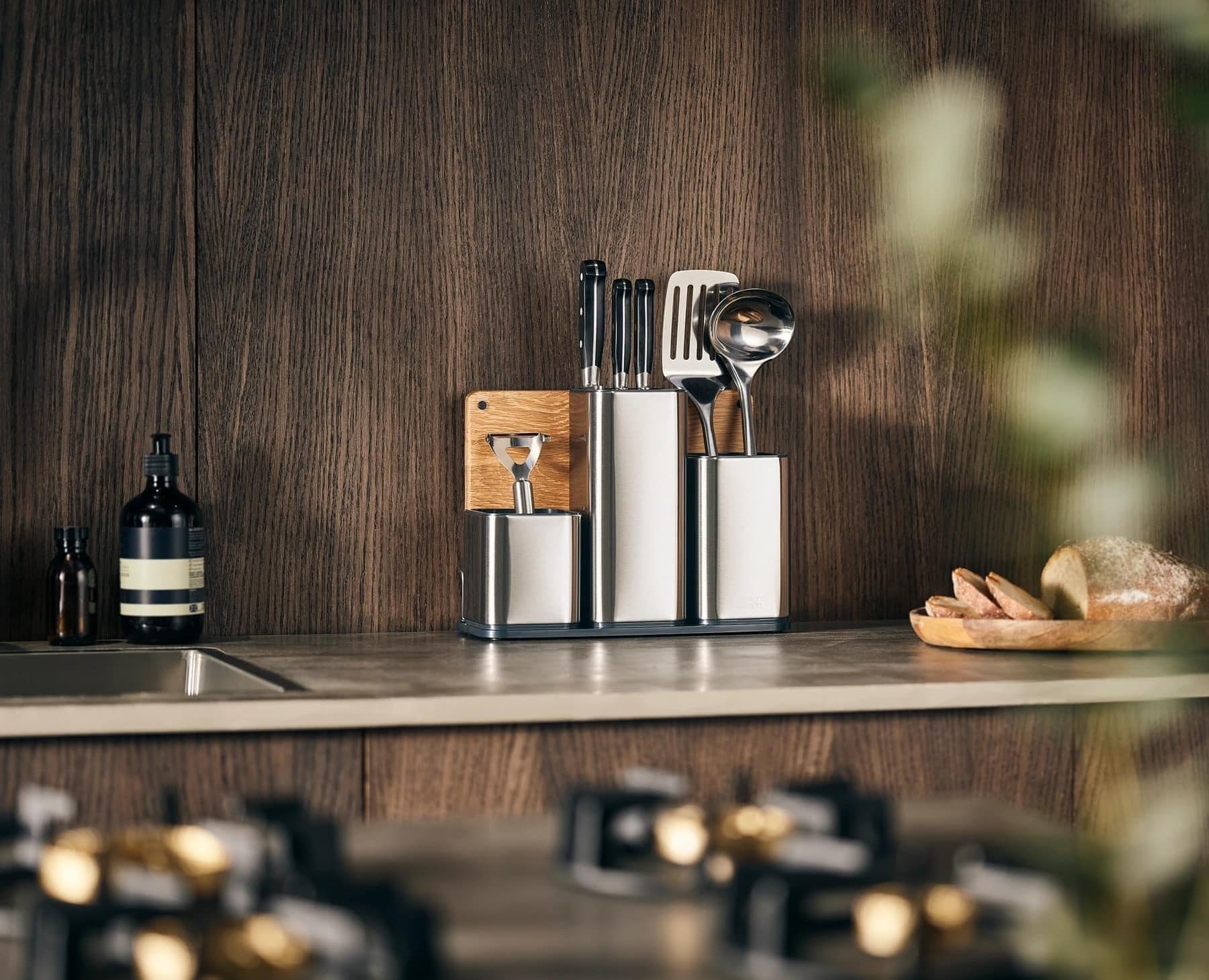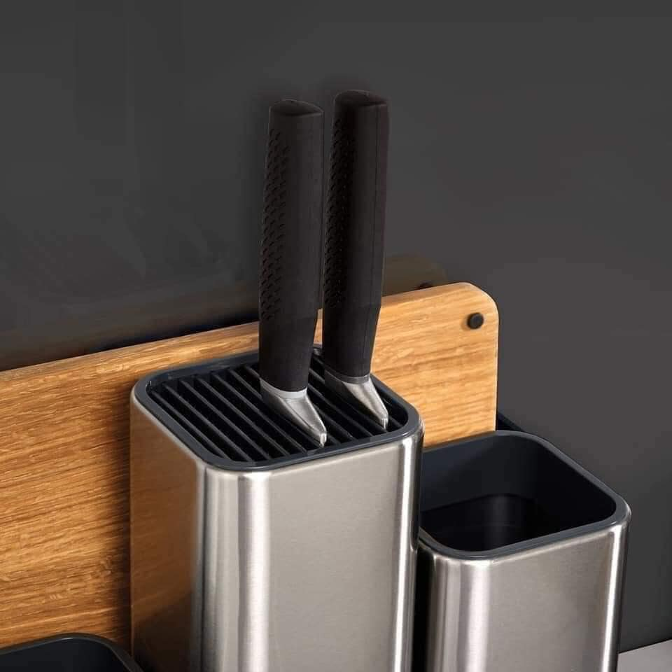 Lưu trữ có tổ chức cho đồ dùng, tiện ích và dao. Thân máy bằng thép không gỉ dễ lau chùi với lớp phủ chống dấu vân tay. Bao gồm thớt gỗ sồi chống trượt. Khe cắm dao không trầy xước giúp giữ chặt lưỡi dao. Thích hợp cho các lưỡi dao lên đến 20cm (8 inch).