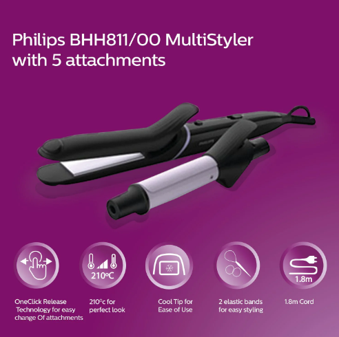 Máy uốn tóc Philips BHH811/00-Hơn 10 giao diện với hướng dẫn phong cách Mỗi ngày một diện mạo khác nhau! Từ mái tóc thẳng và xoăn được đánh bóng hoàn hảo đến updos và hơn thế nữa, tạo hơn 10 kiểu với Philips Multi-Styler mới với -Hướng Dẫn Mẫu: * Kiểu tóc đẹp Máy ép tóc 80mm cho kết quả đẹp mắt.Thùng uốn 25mm cho những lọn tóc xoăn từ chặt đến lỏng lẻo Hướng dẫn tạo kiểu và 3 phụ kiện tóc hữu ích cho hơn 10 kiểu Nhiệt độ cao chuyên nghiệp cho kết quả hoàn hảo - Dễ sử dụng Công nghệ OneClick để thay đổi tệp đính kèm nhanh chóng và dễ dàng.Thời gian làm nóng nhanh, sẵn sàng sử dụng trong 60 giây.Mẹo hay để sử dụng dễ dàng và an toàn hơn Dây nguồn 1,8 m Dây xoay để chống rối dây Chăm sóc tóc của bạn Lớp phủ gốm bảo vệ