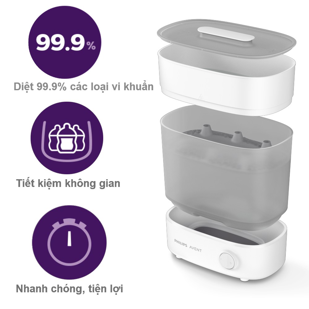 - Dễ sử dụng: cho nước vào đóng nắp, tối đa được 6 bình kèm phụ kiện được khử trùng chỉ trong 10 phút. Sau đó máy tiệt trùng bằng hơi nước sẽ tự động tắt. Các sản phẩm vẫn vô trùng tối đa 24 khi không mở nắp. Khay nhỏ giọt tích hợp mới bảo vệ mâm nhiệt khỏi các giọt sữa do đó giảm được mùi khó chịu. Máy tiệt trùng có thể làm sạch nhanh chóng và dễ dàng từ trên xuống dưới, từ trong ra ngoài, thậm chí cả mâm nhiệt.