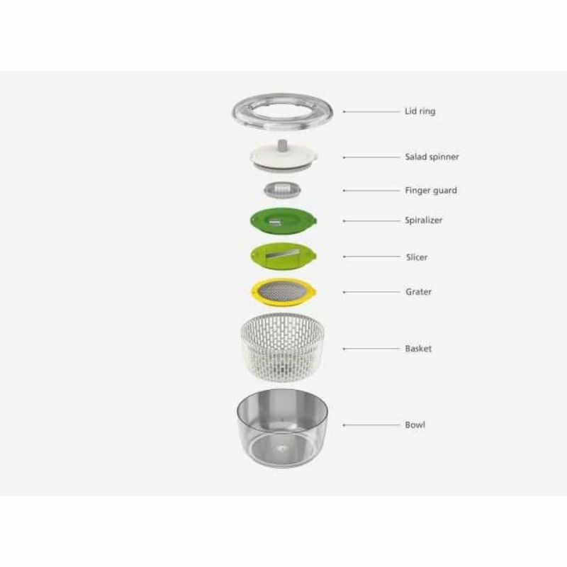 Bao gồm bốn đĩa có thể hoán đổi cho nhau cho các nhiệm vụ khác nhau: máy quay salad, máy cắt xoắn ốc, máy cắt lát và máy vắt